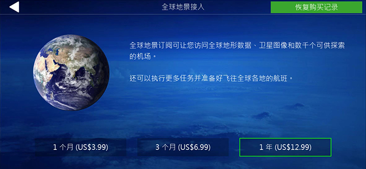 • 游戏下载完成,打开加速器进游戏飞机界面右上角点击恢复购买(Restore Purchses)即可解锁所有飞机,然后一架一架下载;全球地景也需要手动点击右上角点击恢复购买(Restore Purchses)