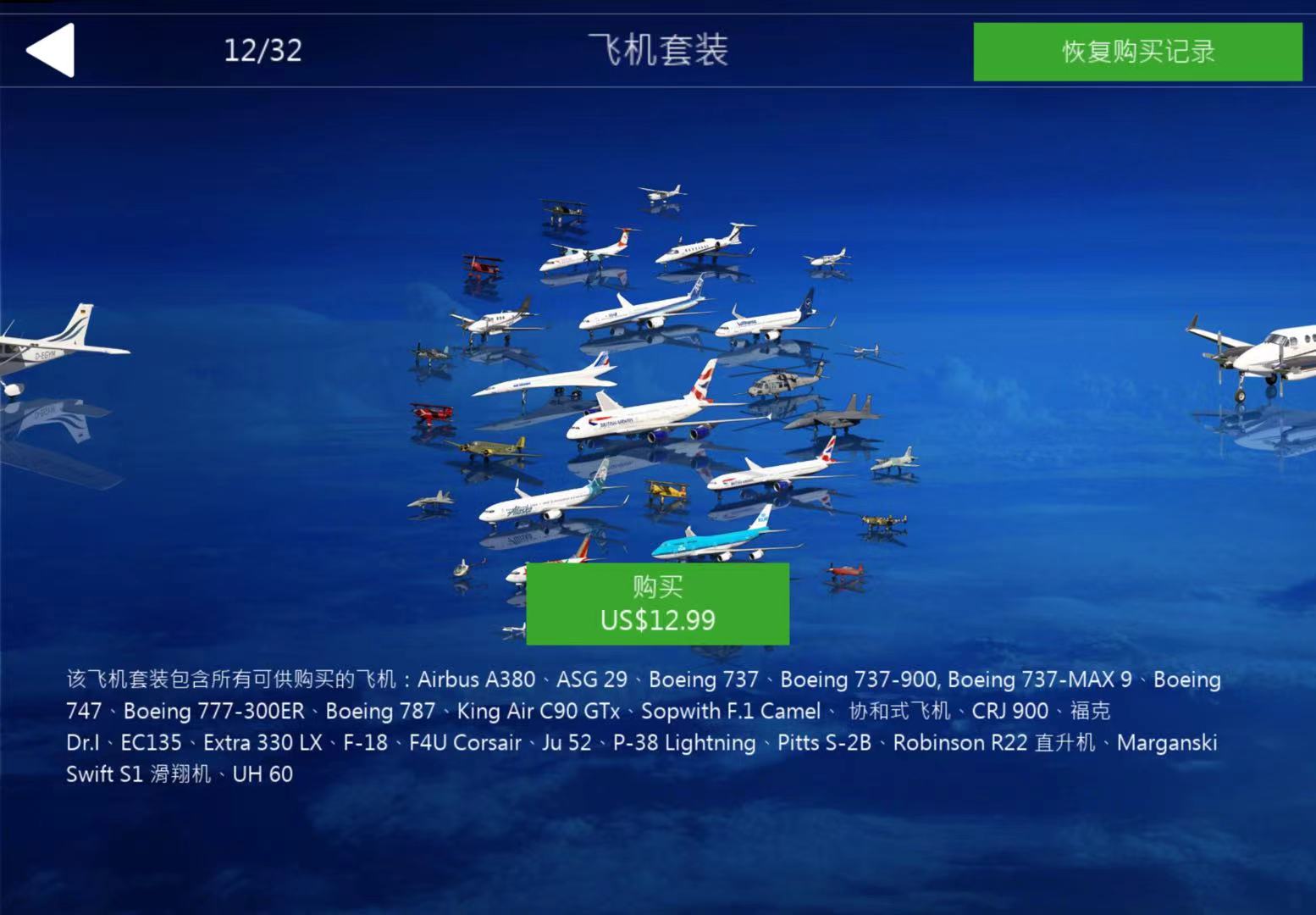• 游戏下载完成,打开加速器进游戏飞机界面右上角,点击恢复购买(Restore Purchses)解锁所有飞机,然后一架一架下载即可,加速器我们不推荐,请自行寻找使用