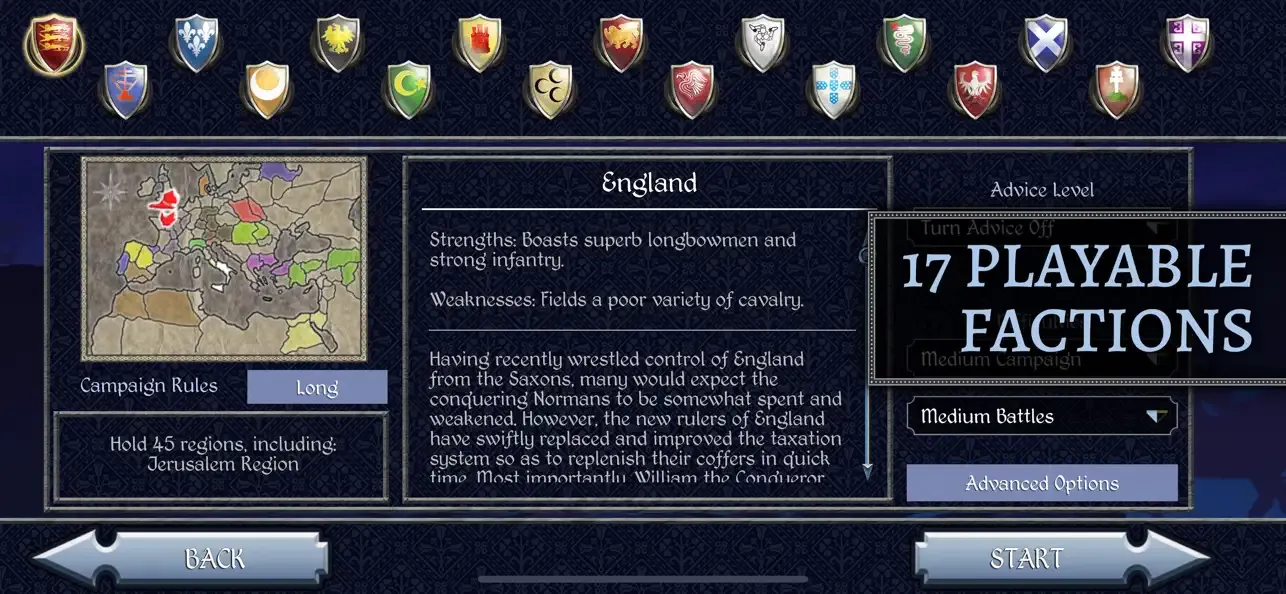 国家选择也非常丰富,你可以选英国、法国、神圣罗马帝国、西班牙、葡萄牙、意大利诸国,也能选拜占庭、俄罗斯、波兰、丹麦、甚至埃及和土耳其,每个国家的兵种风格都不一样,像英格兰的长弓手、法国的重装骑士、土耳其的弯刀兵、蒙古的骑射部队,全都根据历史做了还原,不光是数值差异,视觉表现也非常到位。每个国家开局位置也不同,战略思路完全不同,有的得防着教皇,有的要准备海军远征,有的从边疆崛起一路往西扩张,每局都有新鲜感。